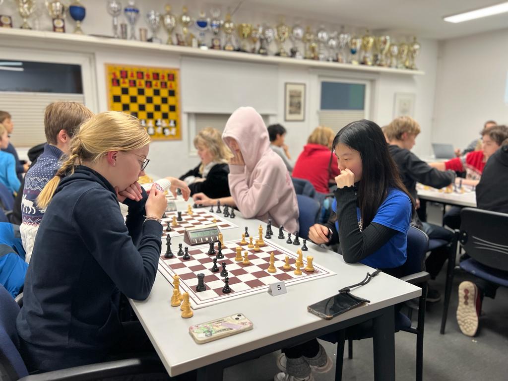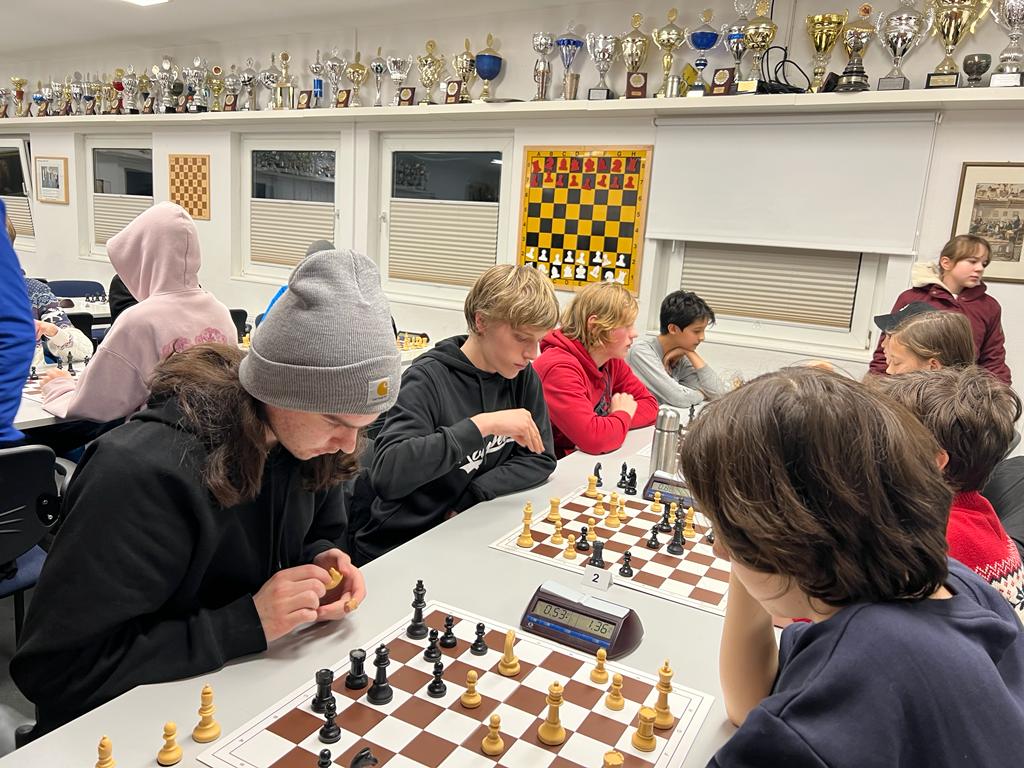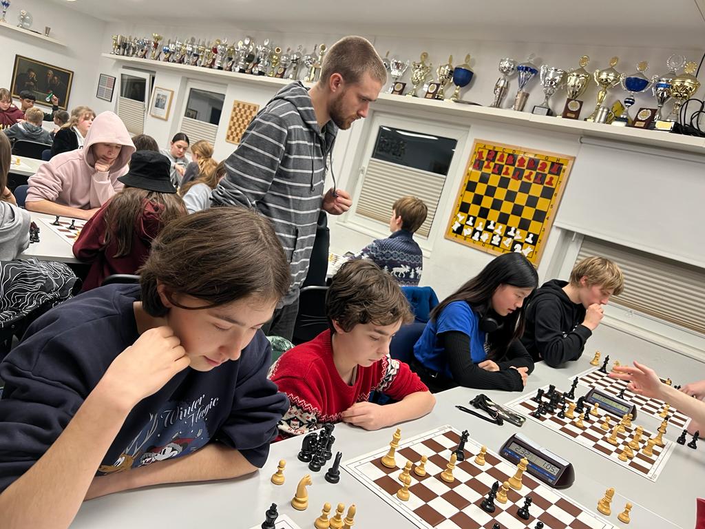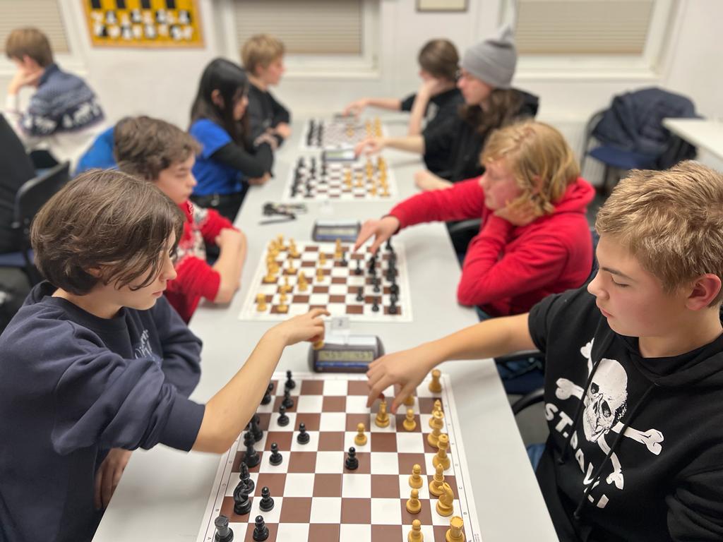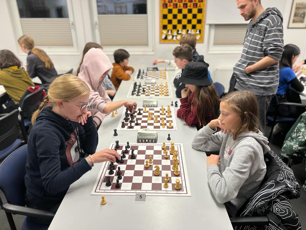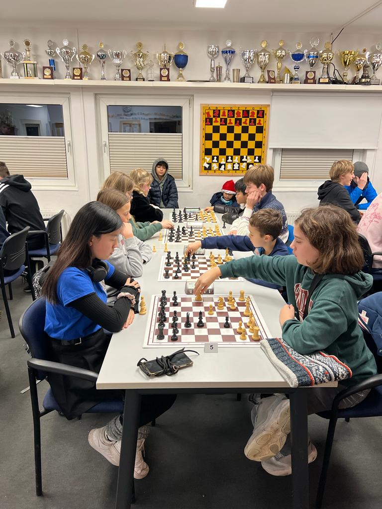 Am Freitag, 15. Dezember 2023 fand wieder vor der Winterferienpause die HSK-Jugendweihnachtsfeier statt. 34 Kinder und Jugendliche hatten wieder viel Spaß beim alljährlichen „Weihnachtsblitzen“ mit nur 5 Minuten Bedenkzeit pro Spieler:in und Partie. Gut gelaunt ließen so alle Klub-Kids und -Teenies das Jahr ausklingen. Lecker waren die Süßigkeiten auf den bunten Tellern und die gespendeten Kekse und Kuchen, vielen herzlichen Dank dafür! Auch der Nikolaus kam, Dank einer großzügigen Spende, wieder mit seinem gefüllten Sack im Klub vorbei und verteilte Überraschungen an alle Anwesenden.