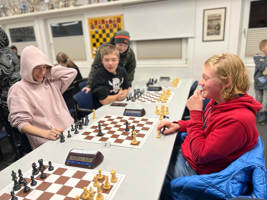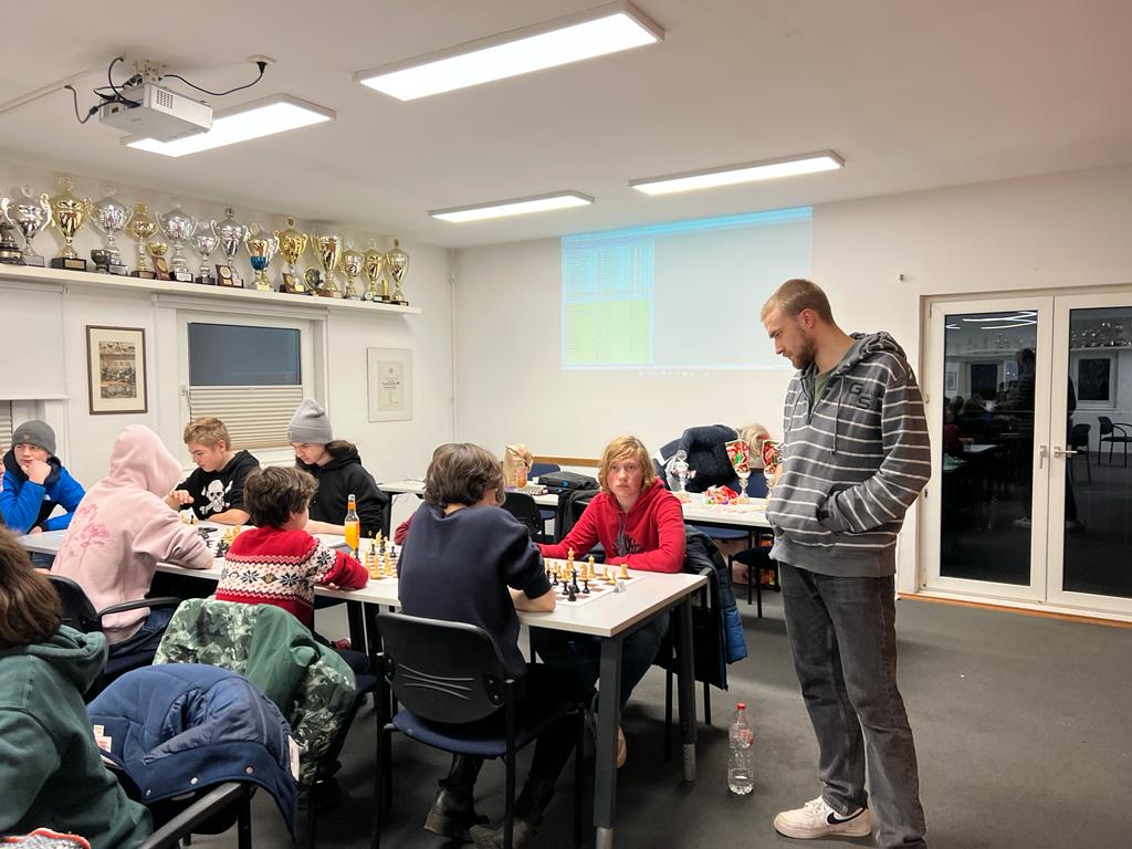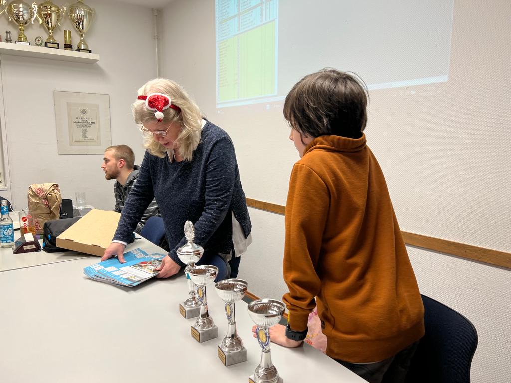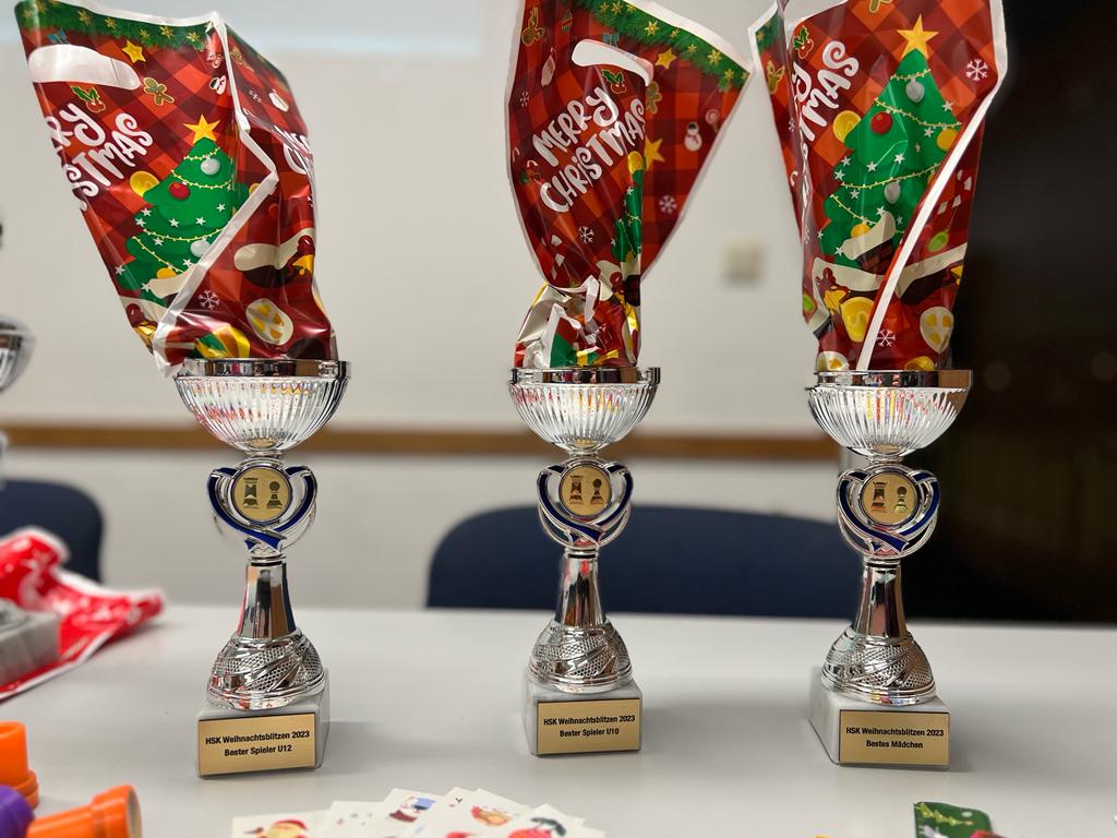 Das Jugend-Weihnachtsblitzen 2023 wurde in 7 Runden von 16 – 18 Uhr ausgetragen: Hier siegte Alexander Wartenberg ungeschlagen mit 6,5 Punkten, das beste Mädchen wurde Alissa Wartenberg auf Platz drei mit 5,5 Punkten, bester U12-Spieler wurde ein Mädchen: Nua Fettan mit 4 Punkten, die den 10. Platz belegen konnte. Den Pokal für den besten Spieler U10 erhielt Elias H. mit 3 Punkten.
