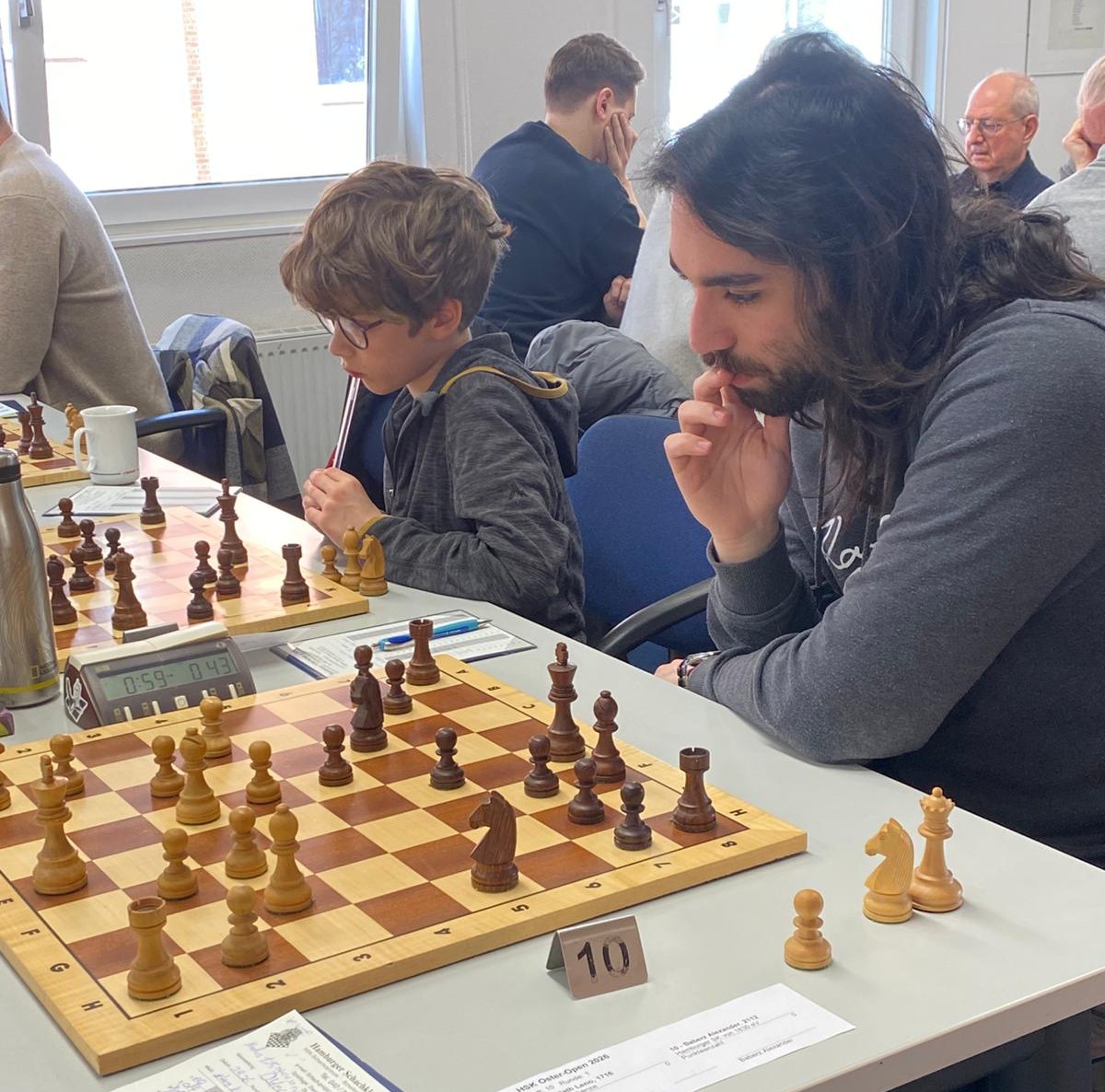 Schon ganz frĂŒh am Freitag Morgen zog guter Geruch durchs HSK-Schachzentrum, denn Andreas Albers buk Laugenbrezeln fĂŒr die Teilnehmer. Oben im Turniersaal stellte Schiri Heinz-Werner Szudra die Uhren, Michael Schenk, Evi Zickelbein und Alexander Baberz bauten die letzten Bretter aus.