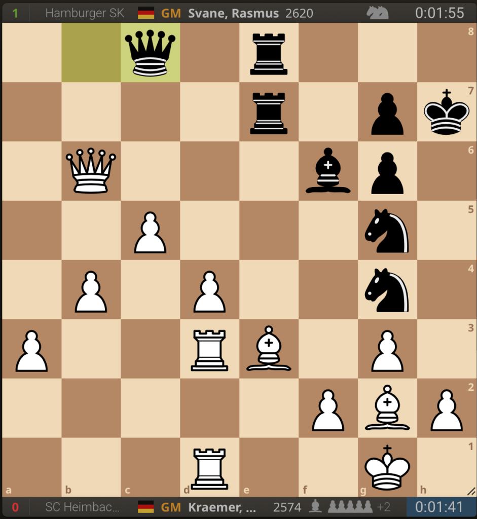 Ein Highlight dieses Mannschaftskampfs war die Partie zwischen den Spielern auf Platz 1 und 2 der Bestenliste der Spieler*innen, die unter deutscher Flagge spielen: GM Vincent Keymer – GM Frederik Svane.