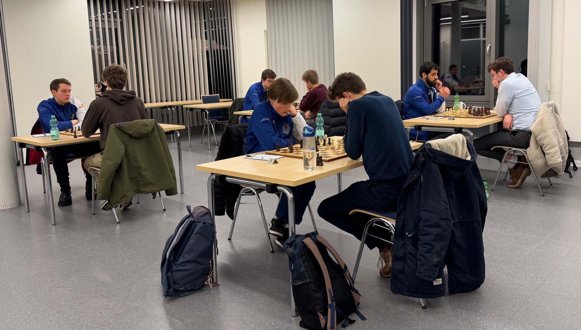 Nach einem schnellen Remis von Merijn van Delft, gewann Henning Holinka eine scharfe Sizilianisch-Partie gegen seinen dänischen Mannschaftskollegen Vitus Bondo Medhus. Dass dann auch Jakob Weihrauch einen scharf angelegten Benoni gegen Magnis Arndt gewann, glich die Niederlage von Malek Koniahli gegen Jasper Holtel aus. Unser einziger Großmeister an dem Tag, GM Sipke Ernst, gewann überzeugend gegen Filip Boe Olsen, so dass wir uns, jetzt schon lange nach der Zeitnot, kaum noch Sorgen machen mussten. Zwar hatte es Isaac Garner schwer gegen Jakob Pajeken, doch wir führten 4:2 und Malte Colpe stand auf Gewinn gegen Daniel Kopylov. Leider aber verzettelte Malte sich nach der Zeitnotphase, verbrauchte viel Zeit und übersah dann wirklich den letzten Trick und verlor noch. So blieb es an Isaac, mit etwas Glück das Remis zu retten. Sowohl Isaac als auch Jakob wurden vom sehr netten Schiedsrichter Fabian große Beilage dazu verdonnert, die Partieformulare komplett abzuschreiben, da sie komplett unlesbar waren.