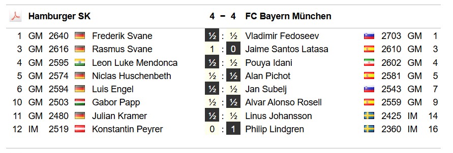 Frederik Svanes Partie gegen Vladimir Fedoseev war wild und nachdem am Königsflügel der Rauch verpufft war, entstand ein Endspiel mit Bauern auf verschiedenen Flügeln. Frederik spielte genau und geriet nie in Verlustrisiko, am Ende konnte er seinen Springer gegen die letzten beiden weißen Bauern geben. Parallel dazu versuchte sein Bruder Rasmus Svane am zweiten Brett, seinen Mehrbauern im Turmendspiel gegen den spanischen 26er GM Jaime Santos Latasa zu einem vollen Punkt und damit zum Teamunentschieden zu verwerten!