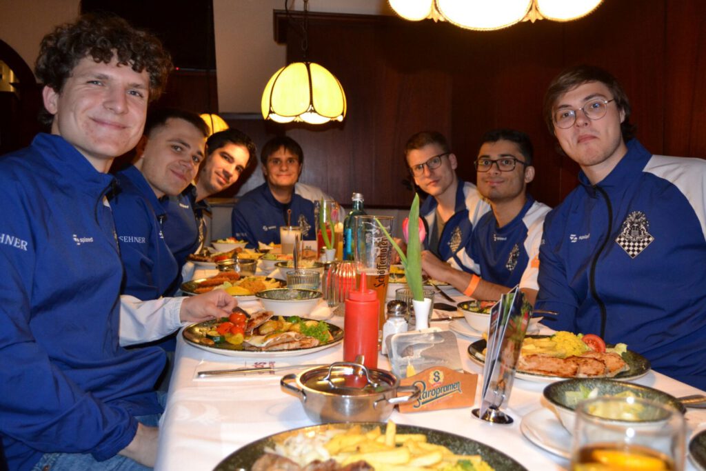 So hatten wir dann kurzzeitig die Situation, dass die Svane-Brüder an 1 und 2 noch gegen die starken GMs Vladimir Fedoseev und Jaime Santos Latasa in action waren und am 7. und 8. Brett die Hamburger versuchten, ihren Elo-Vorteil auszuspielen. Das gestaltete sich aber als schwierig: Julian Kramer an Brett 7 musste länger kämpfen für den halben Punkt und musste sich aktiv mit einem Qualitätsopfer aus einer gedrückten Stellung befreien, in der eher Weiß die Gewinnchancen hatte. Und unser solider Wiener Konstantin Peyrer geriet sogar unter die Räder gegen den schwedischen IM Philip Lindgren, der schon sehr lange in München spielt. In einer sehr langen und schwierigen Partie mit entgegengesetzten Rochaden verwertete Philip Lindgren den Vorteil trotz Zeitnachteil sehr konzentriert und sicher.