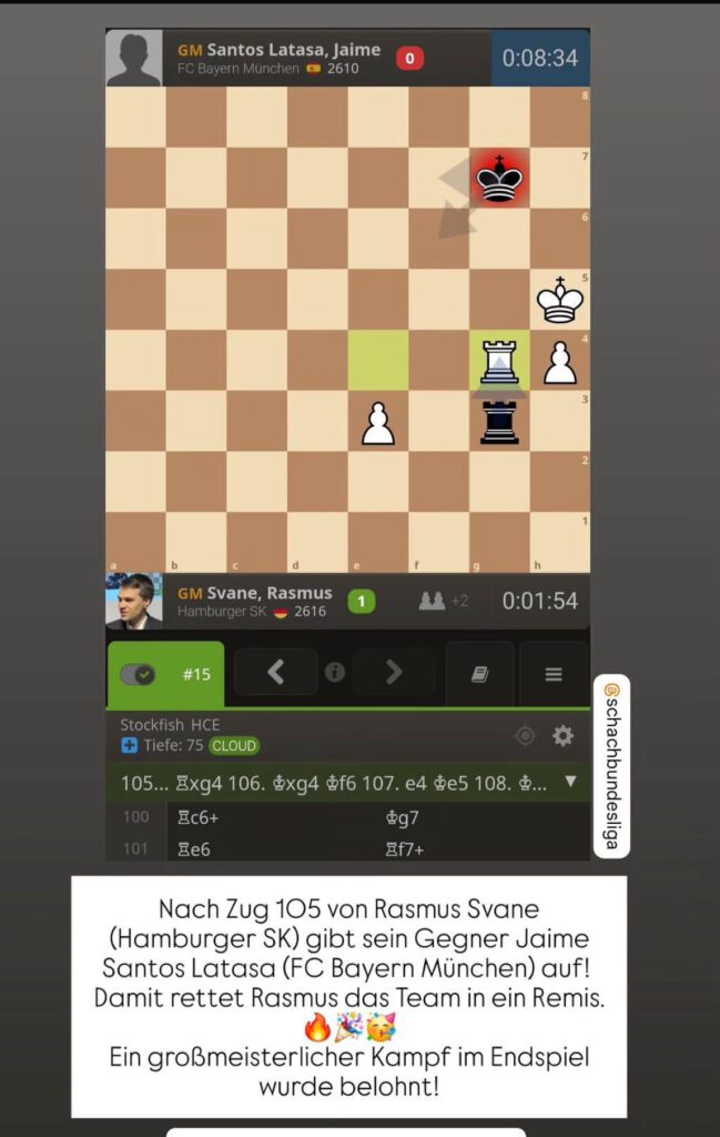 Und das machte er sage und schreibe bis zum 105. Zug und schaffte damit einen Zug vor der 50-Zug-Regel die Sensation und den Ausgleich für den HSK!