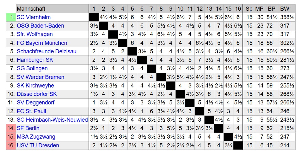 Das Mittefeld von Platz 5 bis Platz 13 liegt extrem eng beisammen und der hohe Sieg gegen St. Pauli am Freitag bescherte uns sehr viele Brettpunkte, so dass wir uns am Ende sogar noch vor die SG Solingen und Werder Bremen schieben konnten. Wir blieben in den drei Runden ungeschlagen und konnten insgesamt 50% der Mannschaftspunkte erkämpfen. Es lief nicht alles ideal und der 6. Platz ist etwas schmeichelhaft, unter dem Strich aber wieder eine sehr solide Saison des Klubs!