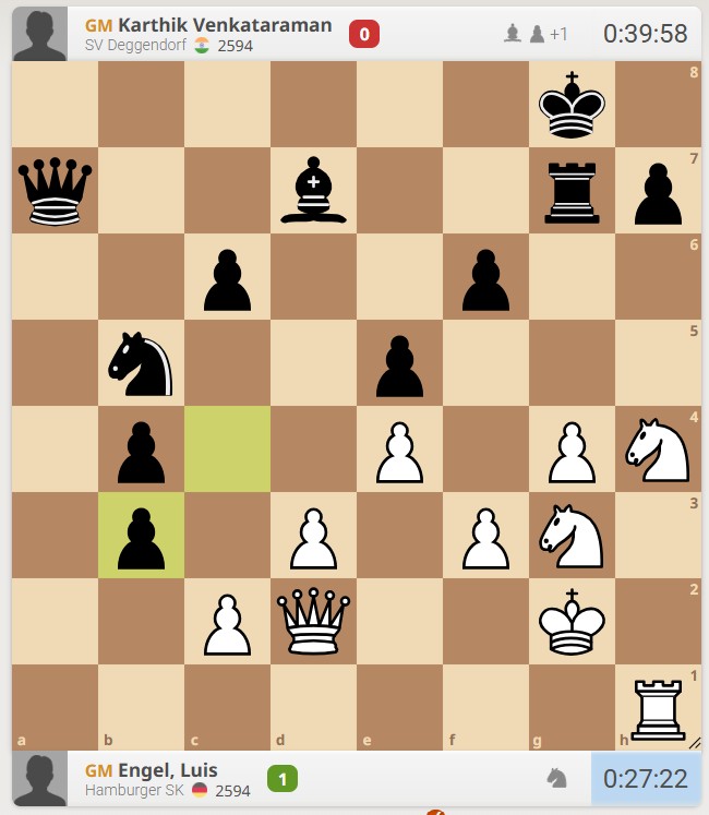 Die zweite Heldentat vollbrachte wieder einmal Luis Engel, der den indischen GM Venkataraman Karthik schlug und damit bärenstarke 9 aus 13 ablieferte! Seine Perfomance liegt bei 2704 und wir können einfach nur stolz und froh sein, Luis in unserem Team zu haben!