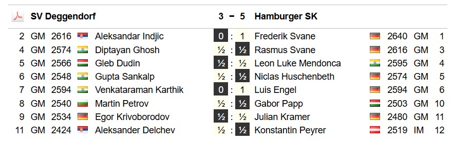 Gegen den SV Deggendorf gab es heute sechs wenig spektakuläre Punkteteilungen. Aber es gelangen heute auch zwei besondere Dinge: Frederik Svane schaffte mit seinem Sieg gegen Aleksandar Indjic seinen ersten Sieg in dieser Saison, das tat doch bestimmt gut! Wie stark die Liga in den letzten Jahren noch einmal zusätzlich geworden ist, zeigt ein Blick auf Frederiks Gegner: nur ein GM unter 2600 dabei und drei Spieler über 2700 (und Frederik machte 6 aus 13).