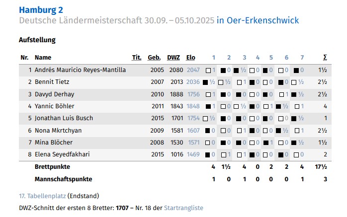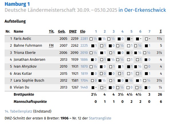 Hamburg stellte in diesem Jahr erstmals zwei Teams sammelte wertvolle Erfahrungen und nutze das Turnier, um zu lernen und sich auf Bundesebene mit den anderen Landesverbänden zu messen. Leider gab es durch Erkrankungen einige Ausfälle und die Spieler mussten sich zum Teil erst einmal akklimatisieren auf einem solchen Turnier. So startete Aras Kutlar (10 Jahre) mit drei Niederlagen, aber dann drehte er richtig auf und gewann vier Mail in Folge! Am Ende wurde Hamburg 1 14. und Hamburg 2 17. und nimmt mit zurück in die Hansestadt, dass oft ein Quäntchen Glück gefehlt hat und dass mit dem geplanten ambitioniertem Training durchaus bessere Platzierungen möglich sind in den nächsten Jahren auf deutscher Ebene!
