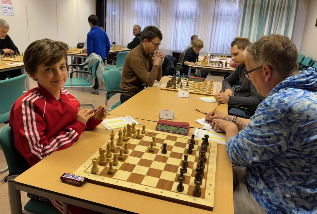 Tobias lieferte sich eine wilde Schottische Partie. Mit Schwarz rochierte er lang (mutig oder leichtsinnig, je nach Perspektive) und startete einen Angriff gegen den weißen König. Die Initiative war da, zahlte sich aber nicht aus: Sein Gegner verteidigte fehlerfrei und erzwang mit einem Turmopfer Dauerschach gegen den exponierten schwarzen König. Wer opfert schon einen Turm fürs Remis? Wer muss, der muss.