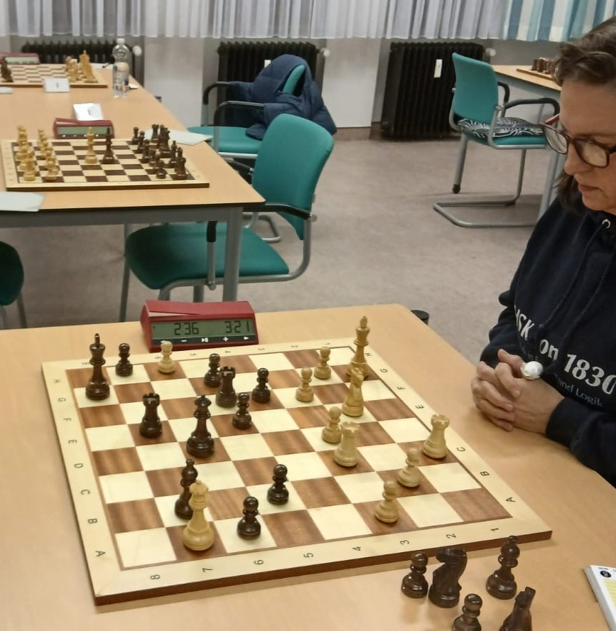 Eva kam schlecht aus der Eröffnung, kämpfte sich aber zurück ins Spiel und erreichte eine sehr aussichtsreiche Stellung. Kurz vor dem 40. Zug dachte sie, dass sie gewinnen könne, übersah jedoch einen Gegenschlag und verfiel danach in mittelschwere Panik und Enttäuschung. die 15 Minuten zusätzliche Zeit nach dem 40. Zug reichte nicht aus, um den Gewinn zu finden 🙁