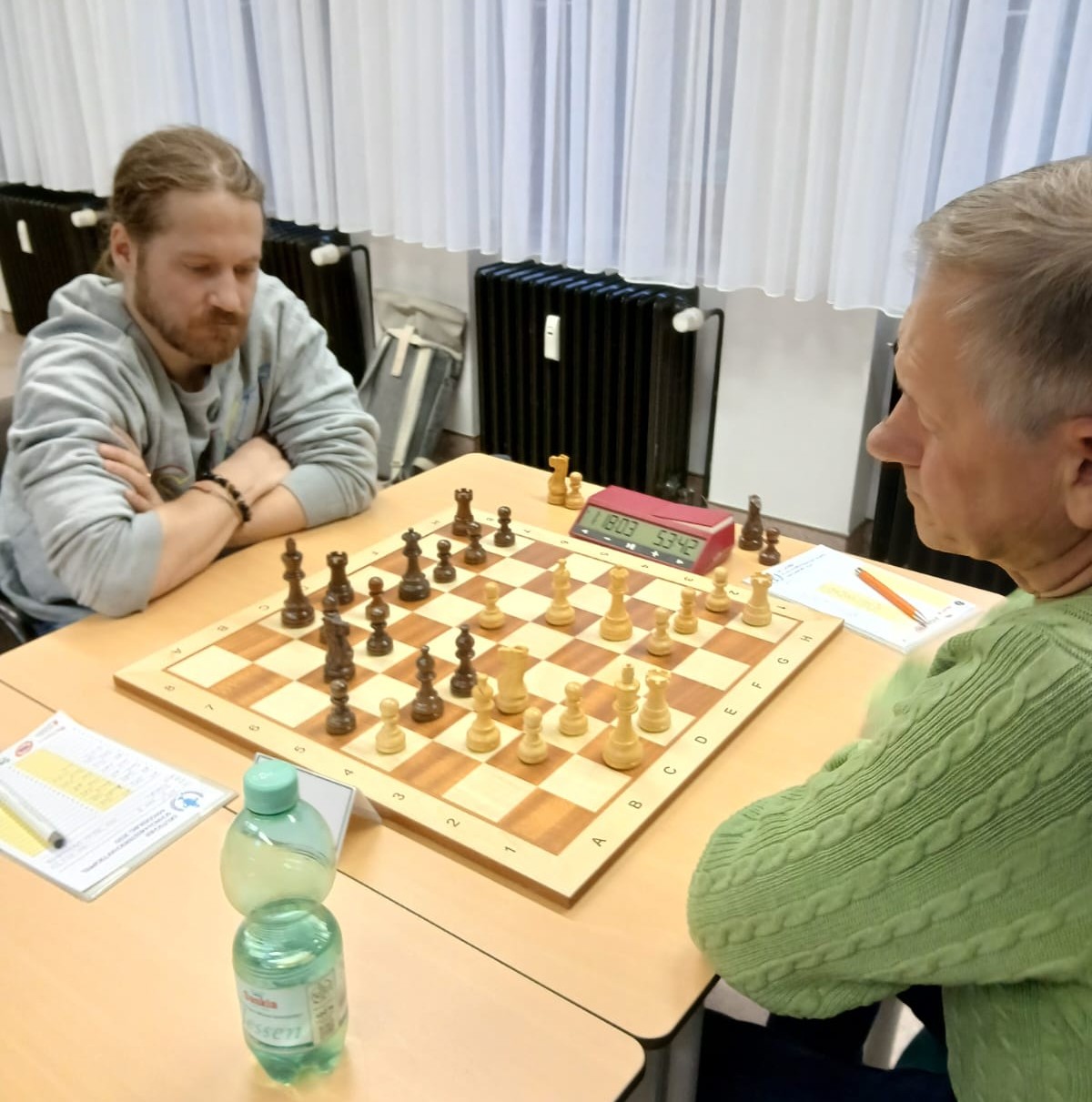 Jonathan spielte mit Schwarz das orthodoxe Damengambit und kam solide aus der Eröffnung. Mit c4 sicherte er sich Raumvorteil am Damenflügel. Es wurde spannend, als Weiß mit e4 das Zentrum aufriss und Jonathan mit Sxe4 zugriff. Ein paar Züge lang sah es so aus, als hätte Weiß die aktiveren Figuren, doch Jonathan verteidigte präzise und ließ nichts anbrennen. Dann: Sein Gegner bot Remis an, obwohl er selbst geringfügig schlechter stand und 20 Minuten weniger auf der Uhr hatte. Jonathan hielt seine eigene Stellung jedoch für nachteilhaft und nahm an. Manchmal ist der gefährlichste Gegner das eigene Bauchgefühl. Remis nach 31 Zügen.