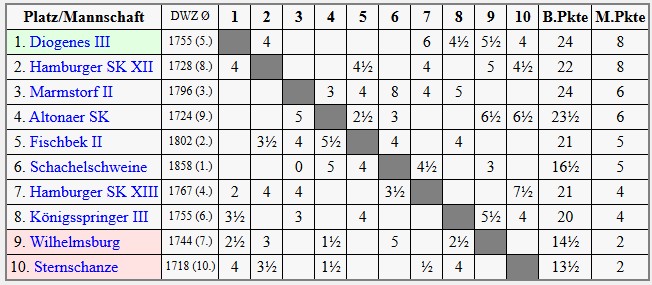 Um 23 Uhr war der letzte Zug gemacht. Mit stolzen 8 Mannschaftspunkten aus 5 Runden stehen wir verdient auf dem 2. Platz der Liga und haben noch 4 Runden vor der Brust. Bereits am Freitag den 17. April erwarten wir mit Marmstorf einen weiteren starken Gegner im HSK-Schachzentrum!