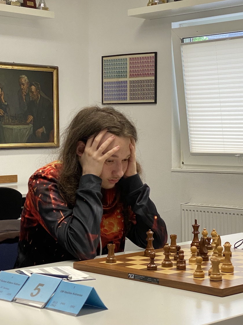 Die erste Runde bestätigte den Ausrichtern, dass die richtigen Spieler ausgewählt wurden. Es wurden alle Partien ausgekämpft bei zwei von fünf entschiedenen Partien. IM Malte Colpe war siegreich in einem Abgelehnten Damengambit, nachdem Tom-Frederic Woelk den Angriff auf seine Königsstellung nicht abwehren konnte. Den zweiten Sieg des Tages bescherte sich Vasilios Kotronais; der legendäre Trainer, Buchautor und ehemalige Weltklassespieler musste seine ganze Erfahrung einsetzen, um eine verlorene Position gegen IM Ruben Gideon Köllner noch zu drehen.
