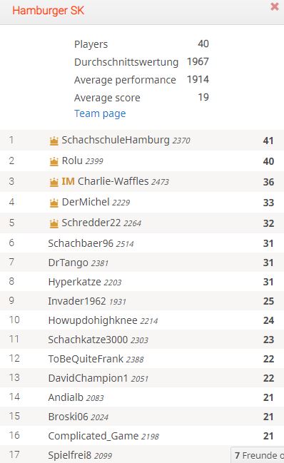 Am Ende schrammten wir denkbar knapp am Podium vorbei und mussten uns mit Rang 4 begnügen, aber es war ein großer Spaß, der vermutlich jetzt erstmal täglich auf Lichess.org ausgetragen wird, mit verschiedenen Bedenkzeiten. Nicht alle „Spitznamen“ lassen sich entschlüsseln, so mancher möchte im Internet lieber incognito spielen, aber einige unserer Spitzenspieler waren am Start, insgesamt 2 Zwillingspaare, unser Jugendwart, das gesamte Jugendbundesliga-Team und einige aus dem Twietenknick, Herrlich Leute, es hat Spaß gemacht! Bis morgen oder in den nächsten Tagen! Schachmatt dem Virus, wir bleiben einfach zu hause und trainieren die Elo-Muskeln!