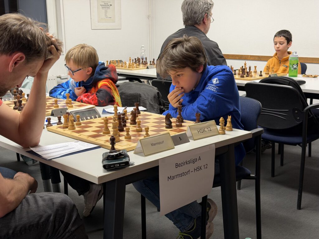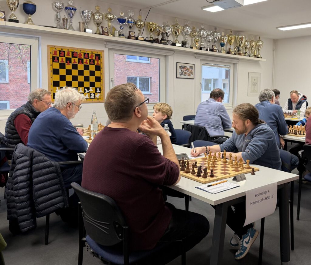 Die Ausgangslage: In der Tabelle standen wir punktgleich mit Tabellenführer Diogenes 3 auf Platz 2, nur ein paar Brettpunkte dahinter. Marmstorf reiste allerdings ohne ihre vier stärksten gemeldeten Spieler an, die sich bereits in der Oberliga festgespielt hatten. Auf dem Papier waren wir damit nicht mehr unterlegen. Trotzdem: Geschenke gibt es in der Bezirksliga nicht.