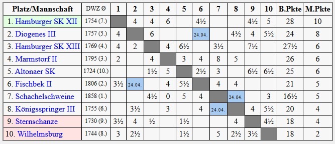 Mit nun satt 10 Mannschaftspunkten und weiterhin ungeschlagen grüßen wir von der Tabellenspitze. Diogenes 3 spielt am 24. April ihre sechste Runde und kann noch nachziehen. Es bleibt spannend. Am 8. Mai wartet ein Schicksalsspiel gegen die starke Mannschaft der Schachelschweine.