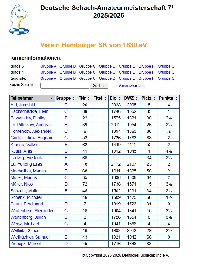 Wie man sieht, waren wir bis auf die Gruppe G in jeder Gruppe vertreten! In der Gruppe F machte z. B. Frederik Ladwig, der mit seinem Mannschaftsführer Malte Schacht in einer Gruppe spielte, 2.5 aus 5 und erspielte sich damit seine erste DWZ – 1513!