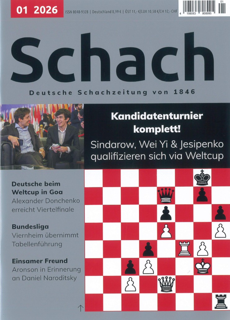Unser Freund und Mitglied IM Jonny Carlstedt ist dort seit einem guten Jahr Chefredakteur, weitere Redakteure sind Dirk Poldauf und Sybille Heyme. Wer also einmal im Monat alle wichtigen News der Schachwelt und fundierte Analysen genießen möchte, der abonniert diese tolle Schachzeitung und unterstützt so eine Institution im deutschen Schach! Für nur 24 € gibt es die mobile Version, wer das Papier braucht, ist mit 72 € dabei.