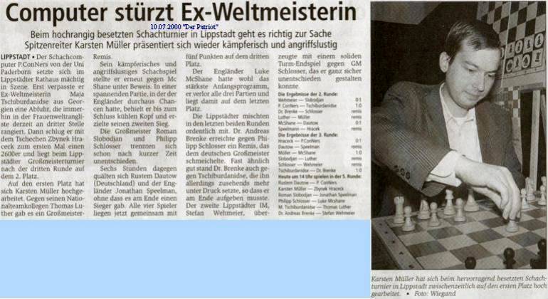 Nachdem IM Luke McShane das Programm Zugzwang 1998 mit einem fantastischen Endspurt noch hatte stoppen können, gab seine Niederlage in der 10. Runde letztlich den Ausschlag zum Sieg von P.ConNers - mit vollem Namen Parallel Controlled Conspiracy Number Search. Das von Ulf Lorenz geschriebene Programm zur Optimierung der Parallelrechnung kann auf 160 mit 450 Megahertz getaktete Prozessoren zurückgreifen und ist damit ungefähr fünfzig Mal so schnell wie ein 450 Megahertz Prozessor - dies entspricht in etwa der Berechnung von 3 000 000 Stellungen pro Sekunde. Damit dürfte das Lippstädter Turnier in die Geschichte eingehen - zum ersten Mal kann eine Maschine ein Kategorie 11 Turnier (Eloschnitt 2521) gewinnen. Zweiter - und Gewinner des ersten Preises - wurde GM Zbynek Hracek (CZE) vor der langjährigen Damenweltmeisterin GM Maja Tschiburdanidze (GEO), die in einem starken Endspurt GM Roman Slobodjan noch überholen konnte. Doch auch für die Lippstädter lohnte sich der Einsatz erneut, denn Dr. Andreas Brenke konnte mit 3.5/9 vorzeitig eine IM-Norm sichern und könnte bald nach Stefan Wehmeier und Heiner Matthias der 3. Lippstädter IM werden. Aus meiner Sicht ließ es sich zunächst sehr gut an - nach 3 Runden lag ich mit 7 Punkten (es wurde die Dreipunkteregel angewandt) alleine in Führung wie im HSK Newsletter Nr.11 nachzulesen ist.