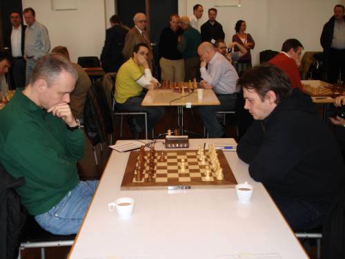 Die beiden schnellen Schwarz-Remisen von Jan Gustafsson gegen René Stern und von Robert Kempinski gegen Drazen Muse beunruhigten uns nicht, schien der Wettkampf gegen den SK König Tegel insgesamt doch den erwarteten Verlauf zu nehmen. Kurz bevor Alexander Laas im Olympia Stadion den HSV gegen Hertha BSC mit 1-0 in Führung schoss, hatte auch Thies Heinemann im Schöneberger Rathaus in nur 21 Zügen gegen Torsten Sarbok die 2-1 Führung für den HSK erspielt, und auch in den fünf verbliebenen Partien kündigte sich keine verhängnisvolle Entwicklung an. Doch als der HSV das 1-1 hinnehmen musste, mussten wir schon zufrieden sein, dass Karsten Müller, der zunächst ein Remisangebot von Rainer Tomczak abgelehnt hatte, kurz vor der Zeitkontrolle in verwickelter Stellung Frieden schließen konnte. Weniger glücklich war Oliver Reeh, der als Schwarzer in ein verlorenes Damenendspiel geriet, das ein Freibauer zugunsten von Ulf von Herman entschied: Der SK König Tegel hatte nicht nur zum 2 ½ - 2 ½ ausgeglichen, sondern witterte die große Chance zum Matchgewinn. Lubomir Ftacnik hatte seinen Vorteil gegen Mladen Muse vergeben - statt kurz vor der Zeitkontrolle die Damen zu tauschen und in ein besseres Endspiel mit guten Gewinnaussichten abzuwickeln, mit dem einzigen Risiko, dass das Endspiel vielleicht doch nicht zu gewinnen wäre, wollte er im Angriff gewinnen und lief in einen Konter. Er rettete sich in ein Endspiel mit Turm gegen Turm und Bauer, das er hätte halten können, aber in der zweiten Zeitnot verlor: 2 ½ - 3 ½. Ich konnte die Spannung nicht mehr aushalten und nach nur noch halb abgewehrten Glückwünschen an die Tegeler Freunde verabschiedete ich mich mit Karsten Müller, wie ich war auch er stark erkältet, zum Italiener Masaniello. Dort unterbrach um 20.05 Uhr Evs Anruf für fünf Minuten die Bestellung meiner Pizza, weil ich Unglaubliches mehrfach nachfragen musste: Radoslaw Wojtaszek und Dirk Sebastian hatten die erwartete Niederlage abgewendet und nicht nur ein noch schwach erhofftes Unentschieden erkämpft, sondern den knappen Sieg, den uns die Werderaner auch in den schwärzesten Minuten des Wettkampfes prophezeit hatten: Radek hatte sein Endspiel mit ungleichen Läufern und zwei gegen einen Bauern gegen den kaum schlagbaren Robert Rabiega (4 ½ aus 9 mit einer Performance von 2652!) tatsächlich gewonnen, und Dirk Sebastian hatte gegen Jörg Pachow eine wilde Zeitnotschlacht, in der beide mehrfach der möglichen Zugwiederholung ausgewichen waren, für sich entschieden. Jörg hatte Dirk mit einem Figurenopfer im Endspiel unter Druck gesetzt. Als ich ging, schien Dirk kaum noch einen Zug zu haben, doch war wohl alles nicht ganz so dramatisch; allerdings gab auch erst Jörgs unerbittliches Spiel auf Gewinn Dirk die Möglichkeit, seinerseits mit zwei Leichtfiguren gegen Turm und Bauer zu gewinnen: 4 ½ - 3 ½. Nun versuchten wir die Tegeler und insbesondere ihren Vorsitzenden Manfred Rausch zu trösten, doch sie waren kaum trostbedürftig, sondern ertrugen auch diese Enttäuschung gefasst und gratulierten uns zum nun gesicherten Klassenerhalt. Und in der nächsten Saison freut sich unsere Zweite, immer ein wenig zitternd, auf die freundschaftlichen Begegnungen mit dem SK König Tegel, der uns beim Rosengartenturnier in Forst und so manchem Blitzvergleich auch wieder einmal hinter sich lassen wird.